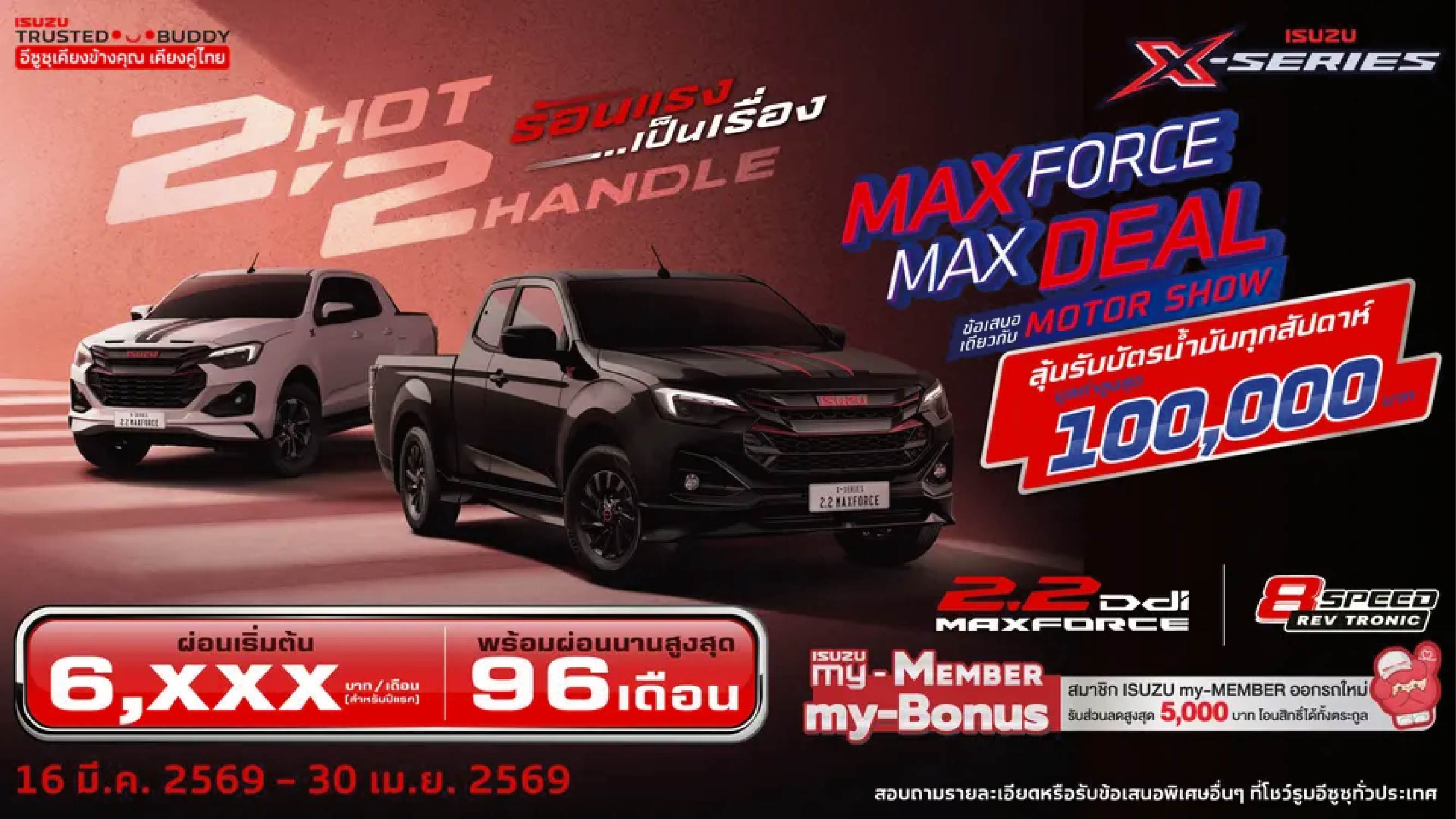 - ผ่อนเริ่มต้นปีแรก 6,160 บาทต่อเดือน สำหรับเดือนที่ 1-12 และผ่อน 8,160 บาทต่อเดือน สำหรับเดือนที่ 13-96 คำนวณจากรุ่นเอ็กซ์-ซีรี่ส์ สปีด 2 ประตู 2,200 ซีซี เกียร์ธรรมดา สีธรรมดา กรณีดาวน์ 25% ผ่อน 96 เดือน ดอกเบี้ย 4.50% อ้างอิงอัตราดอกเบี้ย ณ วันที่ 16 มีนาคม - 30 เมษายน 2569 โดยจะต้องเริ่มชำระงวดแรกภายใน 30 วัน หลังจากวันที่รับรถ โดยเงื่อนไขในการผ่อนชำระให้เป็นไปตามที่กำหนดไว้ในสัญญาเช่าซื้อ