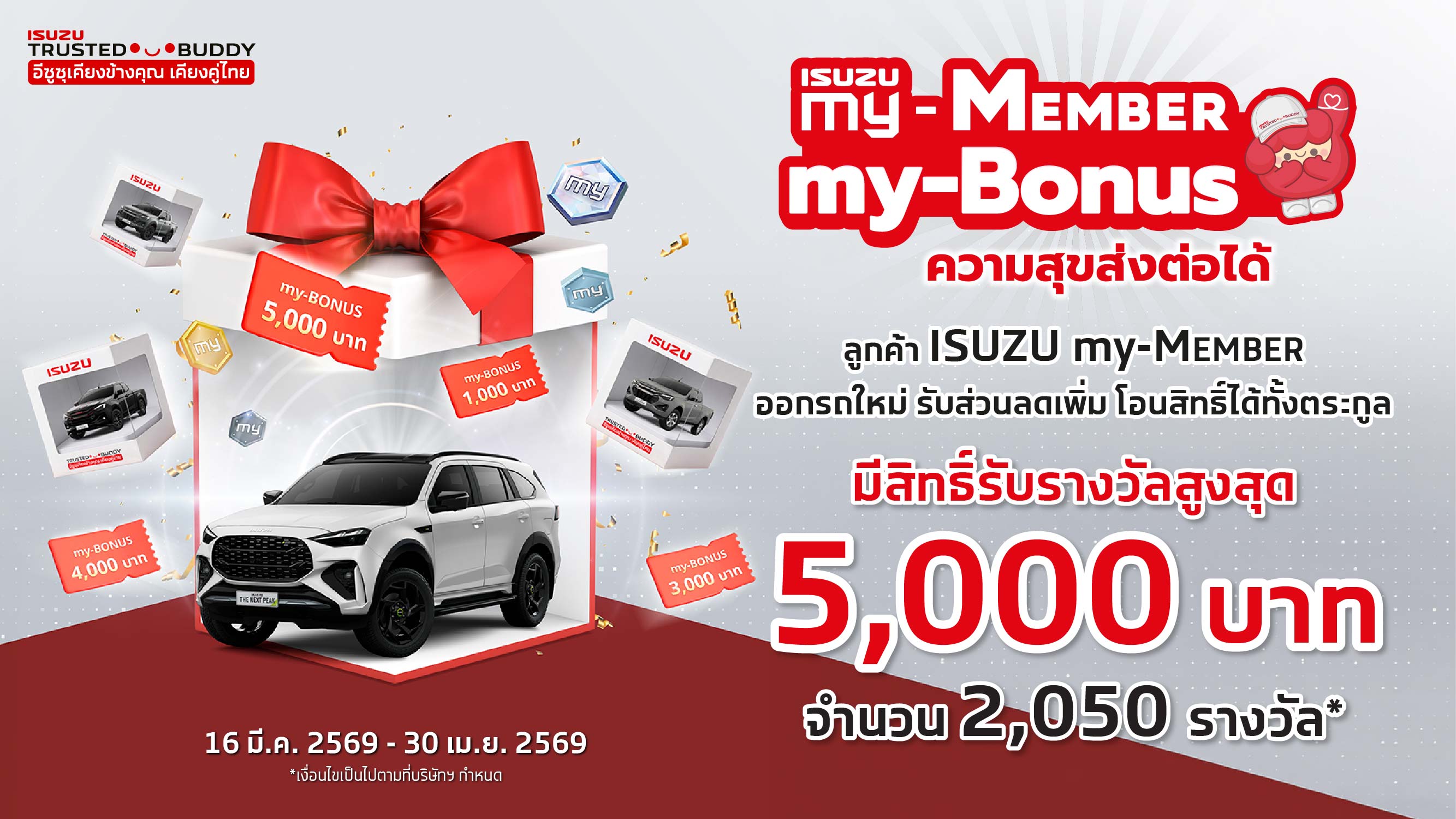 - สิทธิพิเศษเฉพาะสมาชิก ISUZU my-MEMBER! รับคูปองส่วนลดตามระดับสมาชิก และส่วนลดพิเศษ my-Bonus สำหรับซื้อรถใหม่ (D-MAX และ MU-X รุ่นที่กำหนด) พร้อมทั้งโอนสิทธิ์ส่วนลดได้ทั้งตระกูล ลงทะเบียนรับสิทธิ์ได้แล้ววันนี้ตั้งแต่วันที่ 16 มี.ค. 69 - 30 เม.ย. 2569